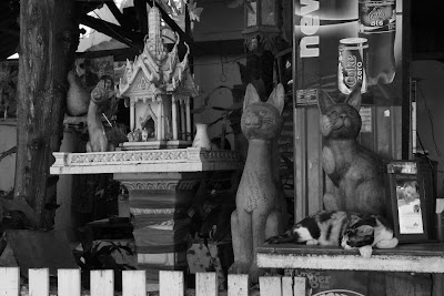 Our visas in hand and a little wiser from the knackering climb we'd gone through we estimated 7 days to reach Chiang Khong from Chiang Mai if we were to take it easy. But the first day's ride to Phrao was mercifully flat with just a few short ascents and followed beautiful valleys. The road out of Phrao was even lovelier as we passed farms along valleys and pockets of lovely wild land with a slight backwind carrying the lovely almost citrusy scent of wild flowering peas. We had two slightly demanding climbs but after the lesson from Pai it was done more or less easily. We surprised ourselves by cycling almost 109km that day and going way beyond our initial plan of stopping in Fang and managing to go upto Thathon instead. Travelling without a guide book and having only the map meant we were quite surprised to see another tourist joint in Thathon as rafting trips down to Chiang Rai are quite popular from here. Another odd 100kms and more beautiful Thai countryside as we crossed isolated pockets of villages and we got our first sight of the Mekong river and the Laos border across as we pulled into Chiang Saen after dark.